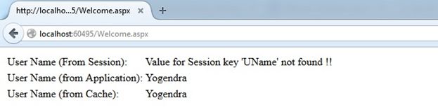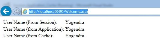 See, now the Session, Application and cache contain the same value, “Yogendra”. Why? Because the session contains user information and the Application and Cache contain the value for the complete web application.