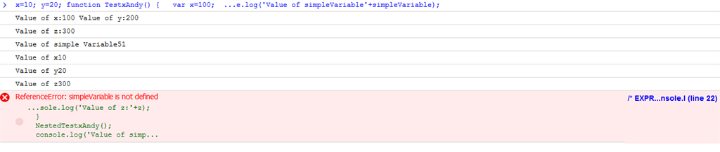 On execution of TestxAndy;NestedTestxAndy is internally called. The scope chain associated with NestedTestxAndy has access to x and y of both of the objects, in other words the global object as well as TestxAndy. Now which value of x and which value of y will he prefer? The answer is the Scope Chain that starts with the most inner to the most outer. For NestedTestxAndy the most inner object is TestxAndy thus 100 and 200 will be displayed. z is a property of the global object and TestxAndy doesn't have any property with the name z. Don't get confused, we have declared z inside TestxAndy but since we didn't use var it becomes a property of the global object. Thus 300 will be displayed. The variable simpleVariable is a property of TestxAndy and it's value will simply be displayed. Well the output after function execution is done, now what about our simple console.log statements where we are displaying the variable's values? The scope chain associated outside has just a global object in its chain, thus our solution is simple. If the variable is a property of the global object then the value will be displayed, otherwise a Reference error is thrown. Therefore x will be 10, y will be 20, z will be 300 and accessing simpleVariable will throw a Reference Error because it is not the property of the global object.