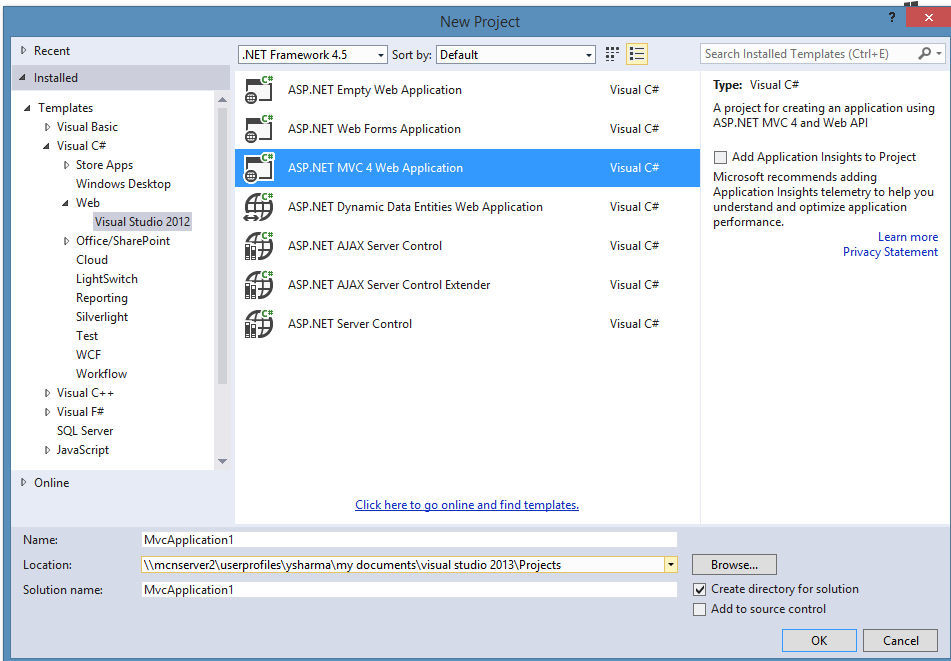 Step 3: Now we will select the ASP.NET MVC 4 Web Application and click on the OK button.