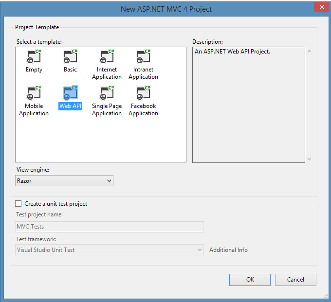 After selecting MVC 4, we will select Web API in the next generated window and click on the OK button.