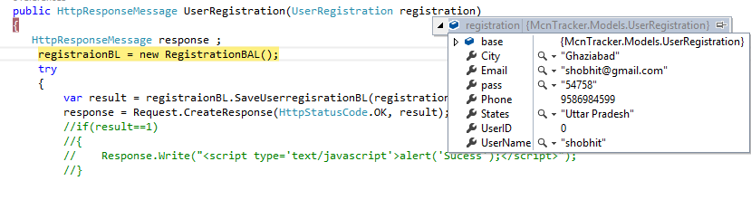 - public HttpResponseMessage UserRegistration(UserRegistration registration) {