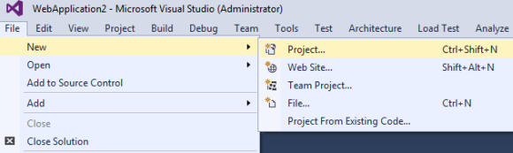 For creating ASP.NET 5 applications its necessary to think about the project. In Visual Studio 2015 select from the top menu bar and select File-> New->Project to create the project.