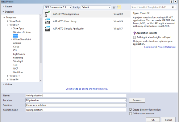After selecting the project, the new project window or dialog box appears. From this box select the Web option under the language of preference. Now we will select the ASP.NET Web Application from the .NET Framework 4.5.3 and choose the project location and file location. Another dialog box will appear after clicking on the OK button.