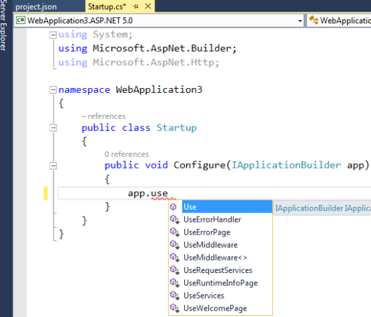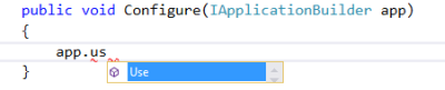 In the configure window we saw only see the Use method. In the next modification, the project will be modified to enable the uses of other methods off of the IApplicationBuilder instance passed in.