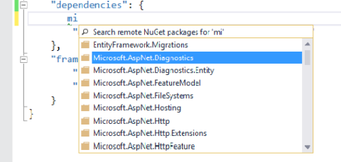 As we can see in the preceding code, the file contains the name/value pairs. It is a new approach for managing web configurations (notice there is no web.config file) enabling simplified dependency management. Instead of adding assembly references, we can now add NuGet packages as dependencies. We can add the dependency by just typing the file above.