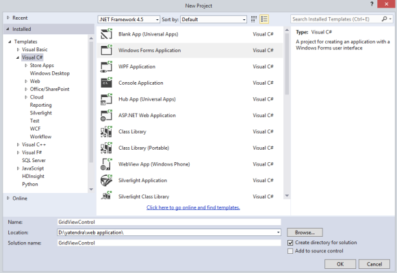We first open Visual Studio 2013 as an administrator and create a New Windows Forms Application. Create it using File -> New -> Project and click on the OK button.