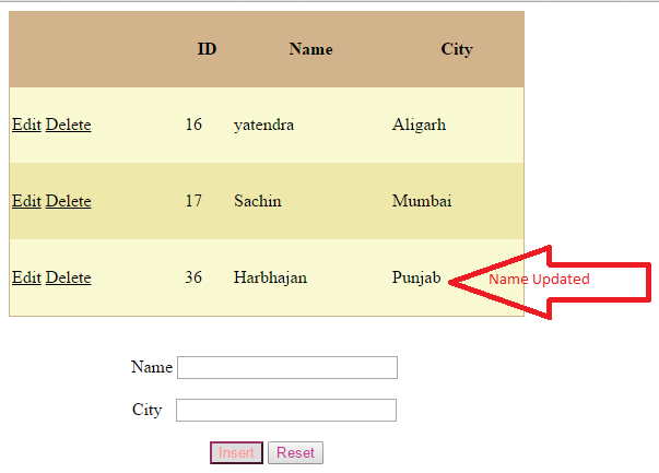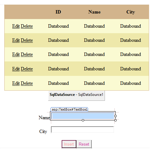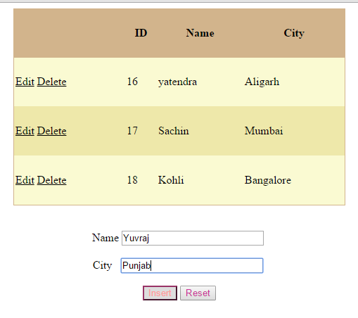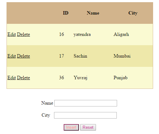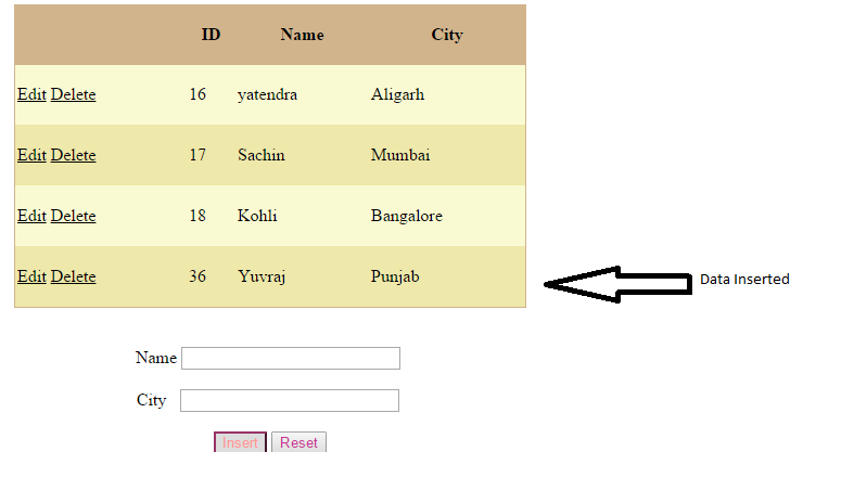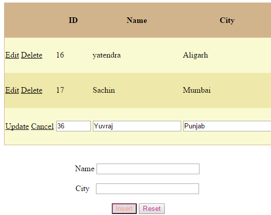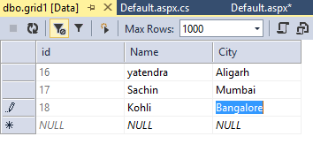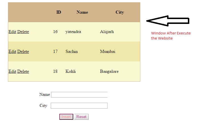 Now we need to ensure that GridView edit, update and delete operations are working. When we provide the values in the Name and City textboxes and click on the insert button, we will get the following window: