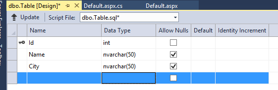 We also need to create a table and make the ID column Primary Key for improving the performance of the GridView and restricting the duplicacy in the data. For this, we will create a table like the following: