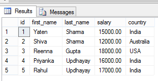 - 4, 'Priyanka', 'Updhayay', 16000, 'India'