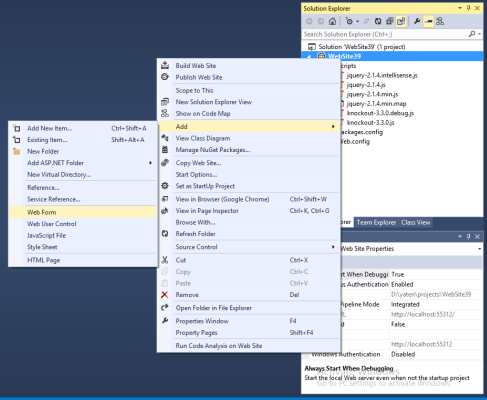 Now the next step to search and install the Knockout.js and jQuery library in the website as I have shown in my previous article. After adding the Knockout.js library we need to add the Web Form to the Website. By right-clicking add a Web Form to the website.