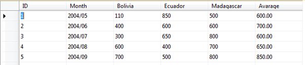 - ['Month', 'Bolivia', 'Ecuador', 'Madagascar', 'Average'],");