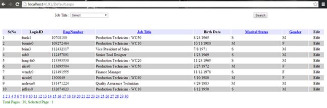 The preceding Stored Procedure will always return <= 10 records with RowNumber manipulated depending on sortBy and Filter expression. Also the OutPut parameter @totalRows returns TotalRows for calculating the pages requred to display the data for the selected sortBy and Filter criteria.