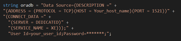 - string oradb = "Data Source=(DESCRIPTION =" + "(ADDRESS = (PROTOCOL = TCP)(HOST = Your host name)(PORT = 1521))" + "(CONNECT_DATA =" + "(SERVER = DEDICATED)" + "(SERVICE_NAME = XE)));" + "User Id= your user id;Password=<strong>******</strong>;";