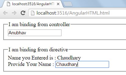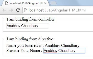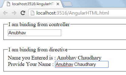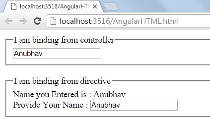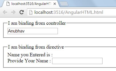In this form I used two fieldsets to distinguish between normal controller binding and custom directive. In the first fieldset I created an input control which is bound to a model named "EnterName."