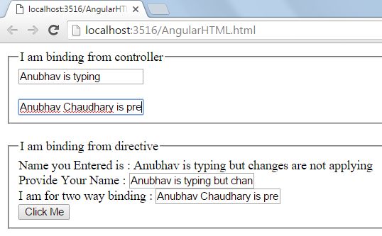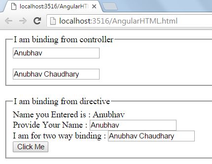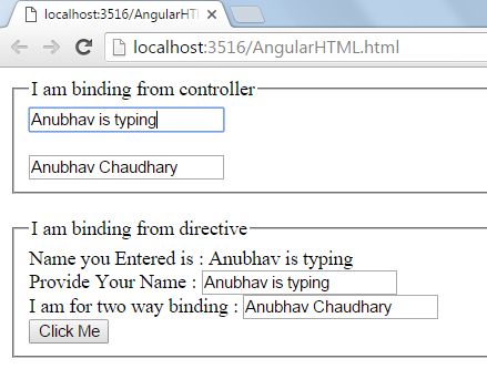 - "Provide Your Name : <input type='text' ng-model='text' /> <br /> I am for two way binding : <input type='text' ng-model='doublebind' /> <br /> <input type='button' ng-click='call()' value='Click Me' />"