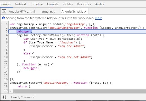 After this I created a controller "angularController" in which factory method is called. Here you can see that I have used ".then;" it works only when our factory method returns something. Inside that first function is the success function and the second one is error function.