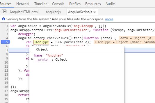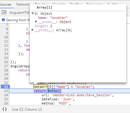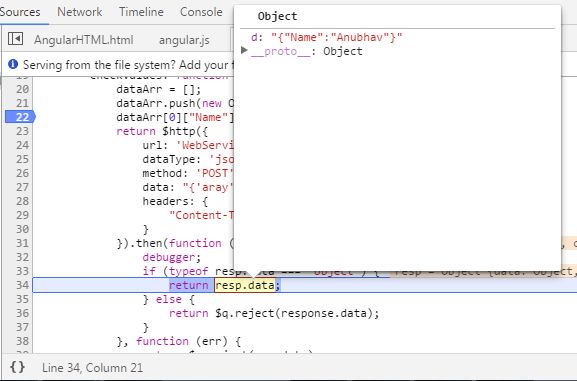 After Controller, I created factory where I made a HTTP POST call to WebService Method, I passed some dummy data in an object. Here also you can see that I have used ".then" which clearly means that functions inside "then" will only execute when something is returned from WebService, if object is returned then it is passed to controller, otherwise deferred state is rejected.