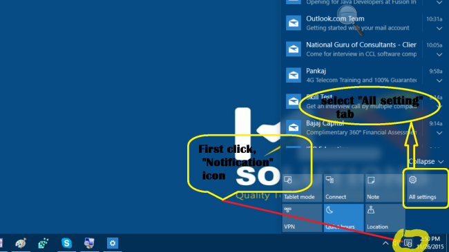 To customize the "Start Menu" of Windows 10 Operating System we will follow some important steps and rules. Step 1: Firstly, press the "Windows" key from keyboard to open "Start Menu". By default "Start Menu" have some limited options and services in views panel as in the following screenshot, Another way is to click on "Start Menu" button for same process. In this screenshot we can see some "online" app tab & "offline" application icons. But i want to create my own start menu. Step 2: Now move mouse pointer on top corner of "Start Menu" panel and hold down mouse pointer and drag to top of window as in the following screenshot. Step 3: Similarly go for step 2 and move pointer on right side corner of "Start Menu" and drag mouse on right side direction of window as in the following screenshot. Step 4: In step 4 we can resize the app tab as in the following screenshot. Step 5: In this we are changing the position of app tab or application icon. Here's the screenshot, Before After Step 6: Again press "Windows" key from keyboard to open new "Start Menu". Right click on paint and select "Pin to Start" option as in the following screenshot, Before After Step 7: Click on "Notification" icon to open "Notification" pop-up window and select the "All settings" app tab as in the following screenshot. Step 8: Again press the "Windows" key to open "Start Menu", After pressing "Windows" key we can see new look and feel. The "Start Menu" panel is changed to full screen mode and also hide the navigational start up programs and apps icons. Here's the screenshot,