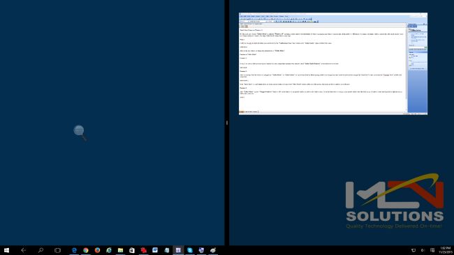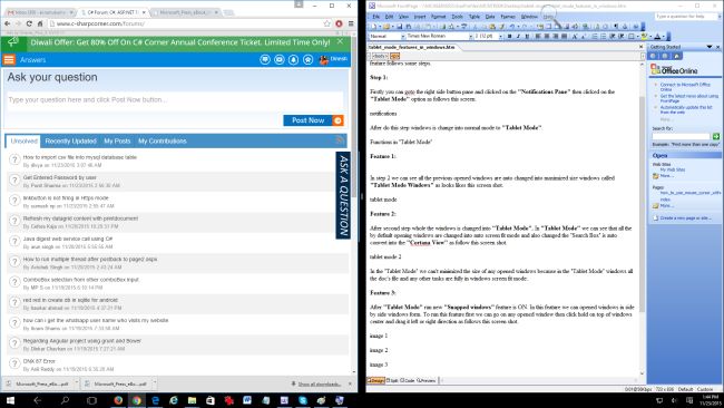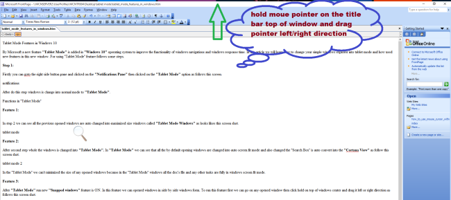 After "Tablet Mode" new "Snapped windows" feature is ON automatically. In this feature we can open windows side by side. To run this feature first we can go on to any opened window. Then hold mouse pointer on top of windows center and drag it to left or right direction as in the following screenshot,