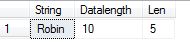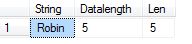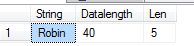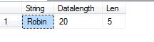 - SELECT @string AS 'String', DATALENGTH(@string) AS 'Datalength' , LEN(@string) AS 'Len'