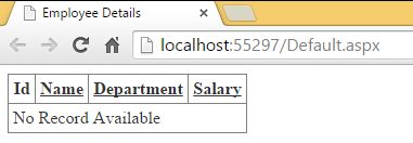 Suppose we need to find the list of Employees with Salary < 10,000. If you look at the preceding table, it is clear that no employee have a Salary less than 10,000. So our query fetches nothing for the Grid View.