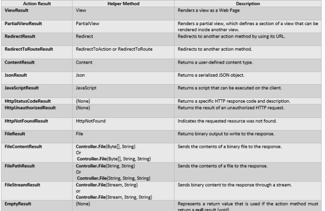 Action ResultsThe various types of action results that can be returned from an action method are described in the following table. The table is taken from the official MSDN documentation of ActionResult class [