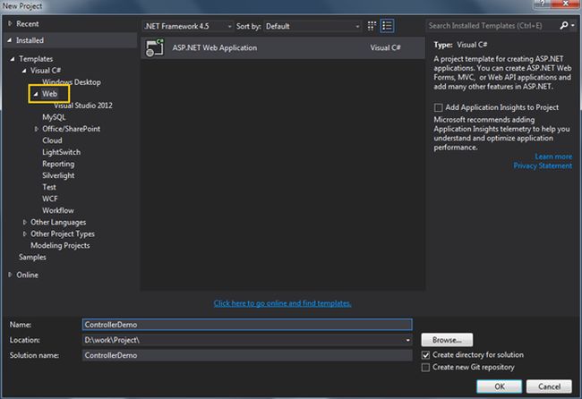 A dialog window appears that asks for the type of the project. Click "Web" on the left side of the dialog window for ASP.NET Web Application. Give it a suitable name and Click OK.