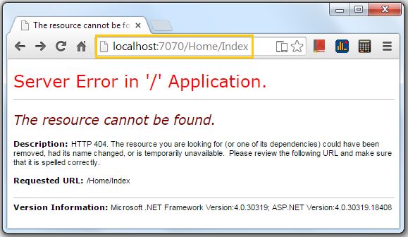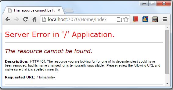 If we execute the following code and look for the Index action method, it gives us a 404 error.