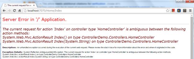 Whoa, it throws a System.Reflection.AmbiguousMatchException instead of executing the code. The error says, "The current request for action "Index" on controller type "HomeController" is ambiguous".