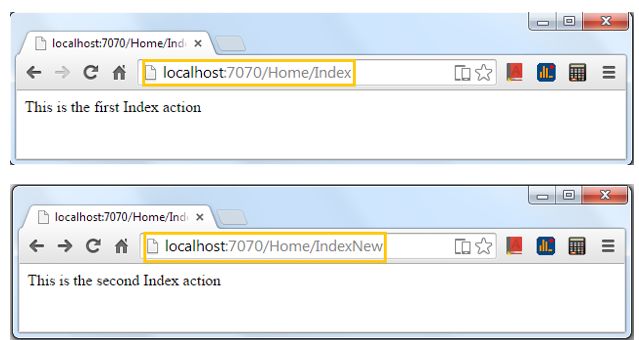 Here, I'm giving the second action method an alternate name IndexNew to distinguish it from the first one. In this way, we can have two action methods with the same name inside a controller.