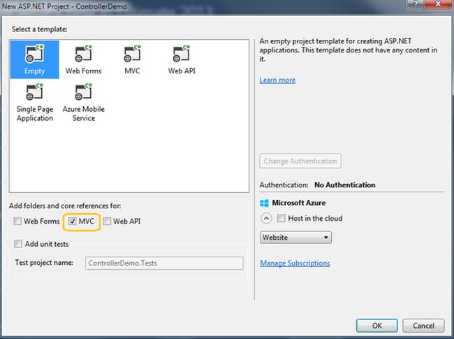 Step 2: A new dialog window asks you to select the template for your web application. Since we are creating a web application using the ASP.NET MVC framework and must learn everything from scratch, choose the Empty template.