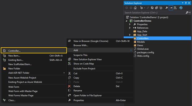 To create a Controller, right-click on the the Controllers Folder and select Add and then Controller.