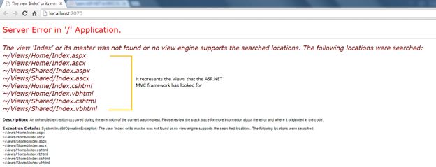 This error occurs because we didn't have any view with the name Index to be rendered on the browser, but you get the idea about the ViewResult class that is used to render the View to the user.