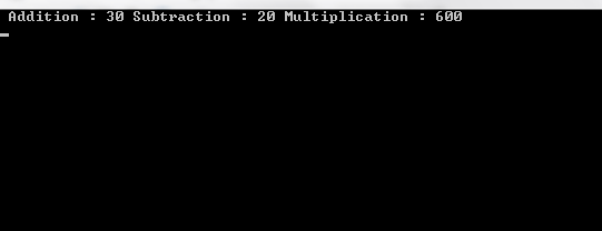 - Console.WriteLine(" Addition : {0} Subtraction : {1} Multiplication : {2} ", add, sub, mul);