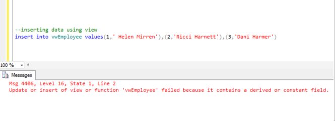As expected, since it is a readonly view, it is not allowing us to insert records into the view.