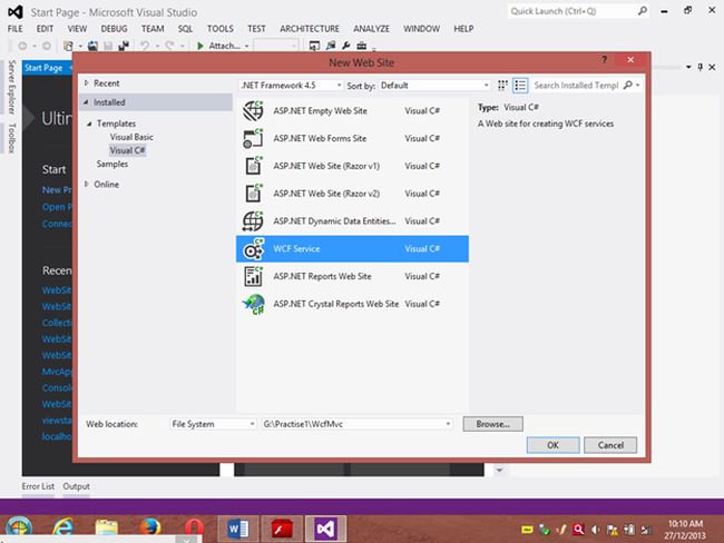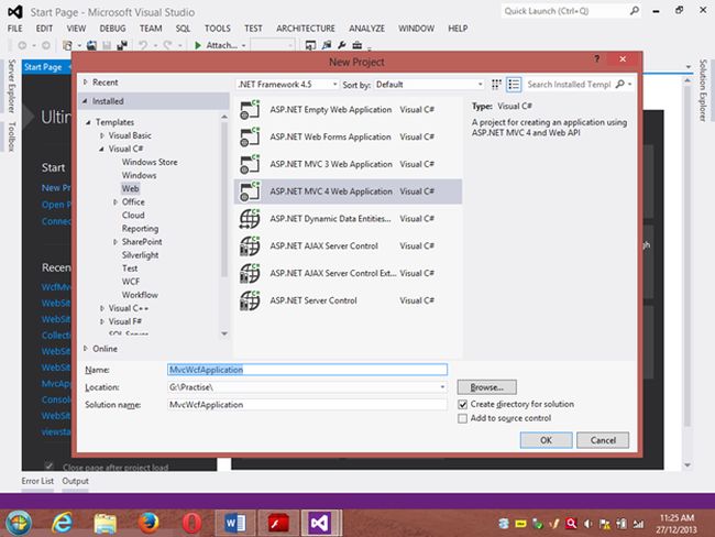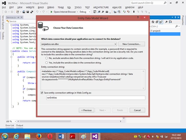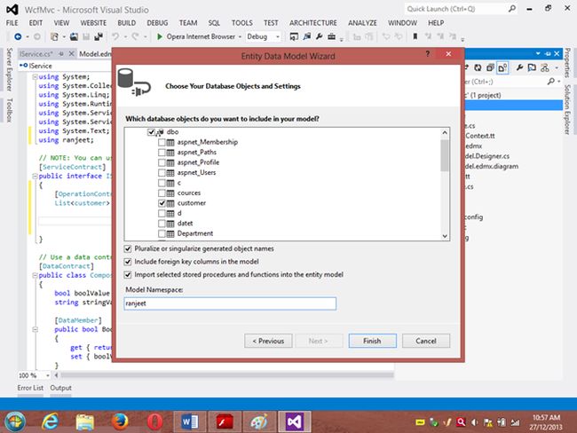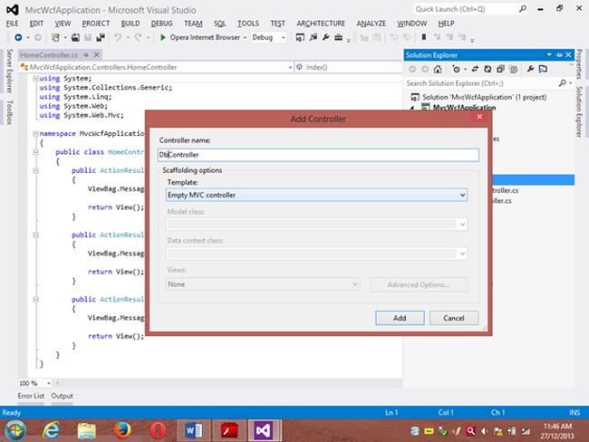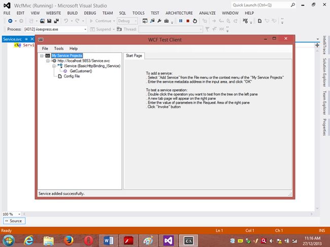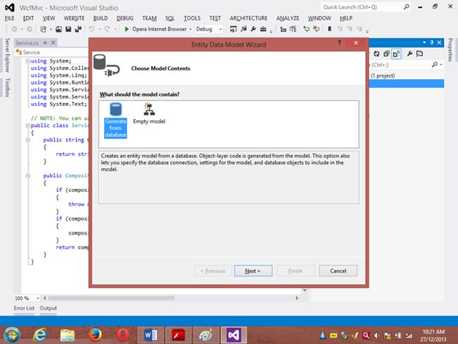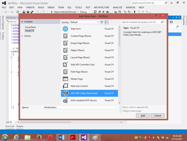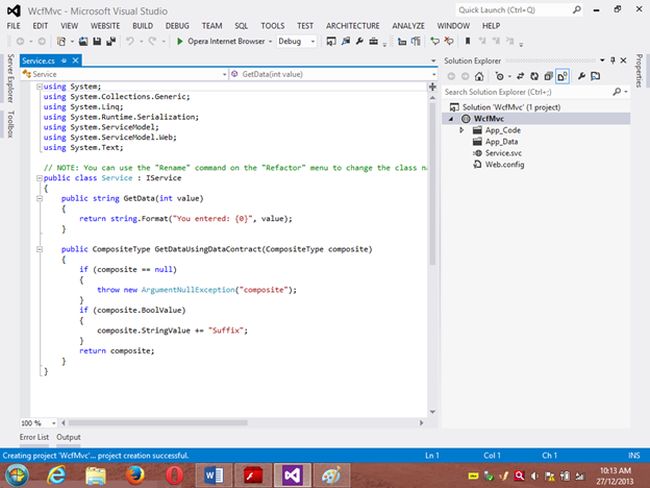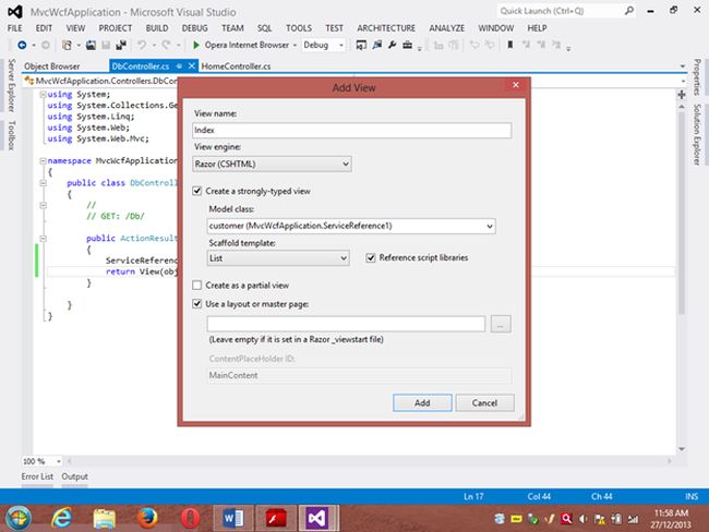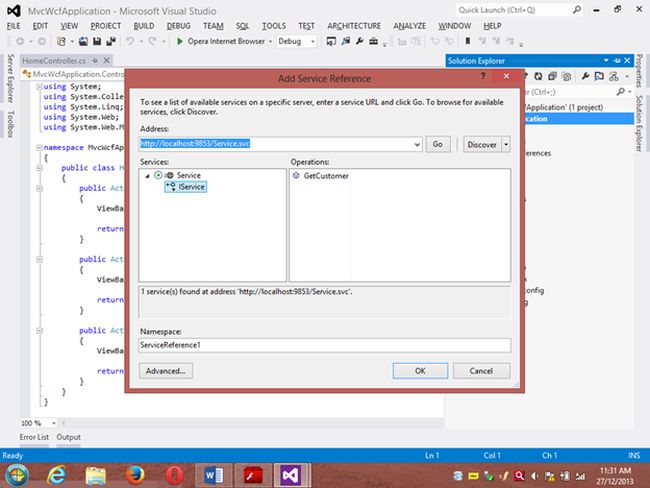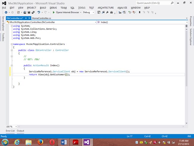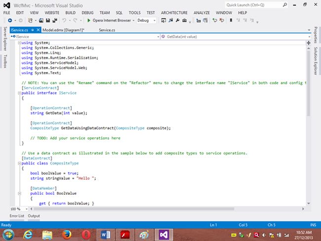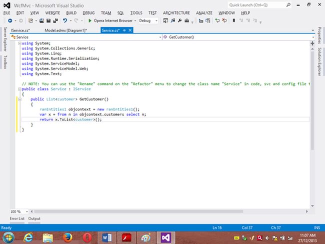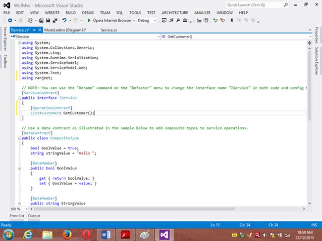 Project 1: WCF ProjectStep 1 Go to VS 2012 and select "File" -> "New Website" then select "WCF Service" then provide the name “WcfMvc”.Click "OK".Step 2Go to the Solution Explorer then go to "WcfMvc application" then right-click on it then seelct "Add" -> "Add new item" -> "Add ADO .Net Entity data model". Then click the "Add" button then place the file in the App_code Folder.Step 3Then the Entity Data Model Wizard will be shown. Select "Generate data from database" then click the "Next" button .Step 4Choose your data connection. I’m selecting My “ran” database of SqlServer 2012.Activate the radio button “Yes include the sensitive data in the connection string”.Save the connection string in the config file by enabling the check box “Save entity connection setting in web.config as:“ then click the "Next" button.Orgo to the new connection and create your connection then provide the server name then provide the authentication type then select either Windows Authentication or SQL Authentication then provide the database name then click the "Ok" button. A new connection will then be generated.Activate the Radio Button “Yes include the sensitive data in the connection string”.Save the connection string in the config file by enabling the check box “save entity connection setting in web.config as: “ then click the "Next" button.Step 5Choose which database object you want in your model.I’m selecting the “Customer” table. The table definition is as follows:Create table customer Custno int constraint pk primary key,custname varchar(30) not null,custcity varchar(30),custbalance money);You can use the above table or create your own table and use itThen provide a Model Namespace of your choice.. I’m using “ranjeet” Namespace.Click the "Finish" button.Please ensure that in the Solution Explorer under the App_code folder the Model.edmx file has been created.Your entity data model is ready for use.Step 6Go to Solution Explorer then expand the App_code Folder then go to the Iservice.cs file.Step 7Delete the Getdata() and GetDataUsingDataContract() methods.ThenI’m writing one method GetCustomer() as follows.Step 8Then go to the Sevice.cs file and implement the method declared in the IService.cs interface.In the Service.cs file right-click the Iservice Interface then select "Implement Interface" -> "Implement Interface".Delete the already present method in the Service.cs the file.And write the following code in the “public List<customer> GetCustomer()” method.“ranEntities1” is a class name given when the connection is created.Step 9Open the Service.svc file and now run the project.A new window will open; copy the URL present in that window and paste it into any text file. This URL will be used in the next project.Project 2: MVC Application 4Step 1Ensure that the WCF project is open then start another instance of VS 2012. Then go to "File" -> "New" -> "Project..." then create an ASP.NET MVC 4 Web Application. Name it “MvcWcfApplication” then click "ok" Button. Then select the Project Template “Internet Application” then click the "Ok" button.Step 2Create a Proxy using “Add Service Reference” by right-clicking on MvcWcfApplication in the Solution Explorer.(Note: Proxy is a class that converts a local request into a remote request.)A new window will open. Paste the URL that you copied from the WcfMvc project into the Address TextBox then click "Go".In other words, a proxy class is created successfully..(Caution: if it has been created and in the project you can’t use the ServiceReference1 namespace Pl then don’t worry; it is a VS 2012 Automation Error. To solve it go to the Solution Explorer then select ServiceReference1 then right-click on it then select "Configure Service Reference". A new window will open then in it uncheck the “Reuse types in referenced assemblies” checkbox..)A serviceReference1 will added into your project.Step 3Now add a new Controller then in Solution Explorer seelct "Controller" then right-click on it then select "Add Controller" (Ctrl+m, Ctrl+c).Name it DbController. Click the "Add" button.Step 4Add the following code in the DbController.cs file.Please build the project.Step 5Now right-click inside the Index() Method then select "Add View" (Ctrl+m, Ctrl+v) then click on “Create a Strongly Typed View” checkbox then select the Model Class we created, in other words “customer (MvcWcfApplication.ServiceReference1)” then select "Scaffold template List"then click the "Add" button.Step 6Run the application.In the browser type: http://localhost:<Port>/DbAnd see the results. All the data in the customer table is shown below the using WCF Service.If you like this then please comment below.THANK YOU.