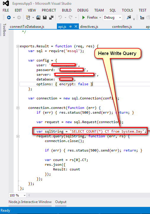 Open the api.js file and set the Microsoft SQL database credentials and database name.