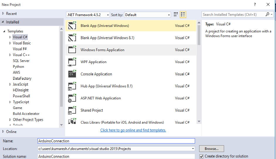 Step 2: From the New Project window select Visual C# from Installed, Templates, then select Windows Form Application.