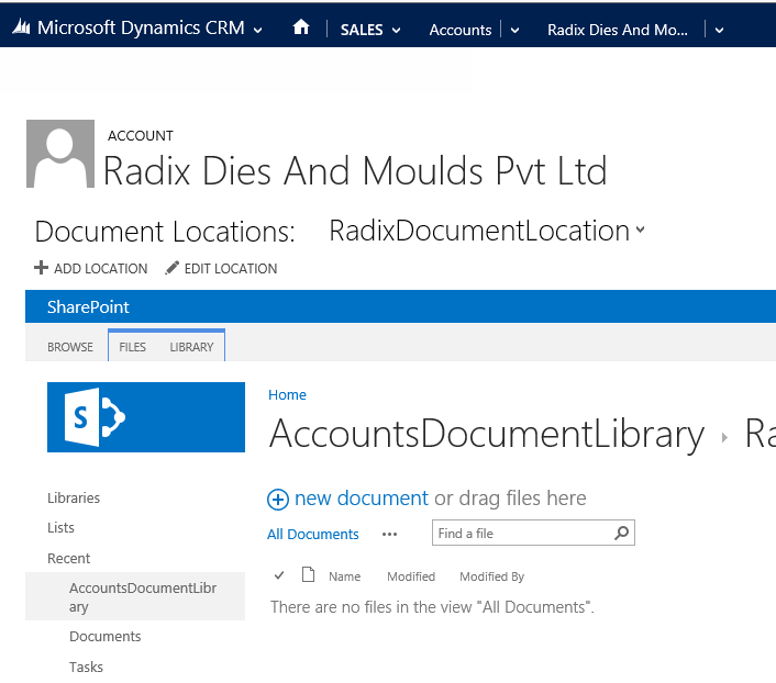 Step 9: And if everything goes right, you will see the familiar (at least to me) interface of SharePoint from within Dynamics CRM as shown below. You can start uploading documents and use document management functionality.
