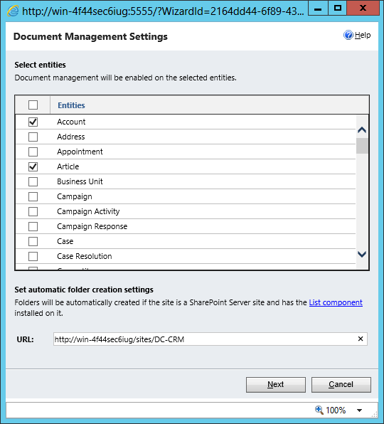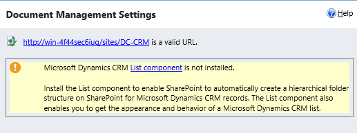 Step 3: Click on Document Management Settings, enter the SharePoint site URL where you want to save documents. Click Next. In case you don't have the Microsoft Dynamics CRM List Component it will give you the following warning.