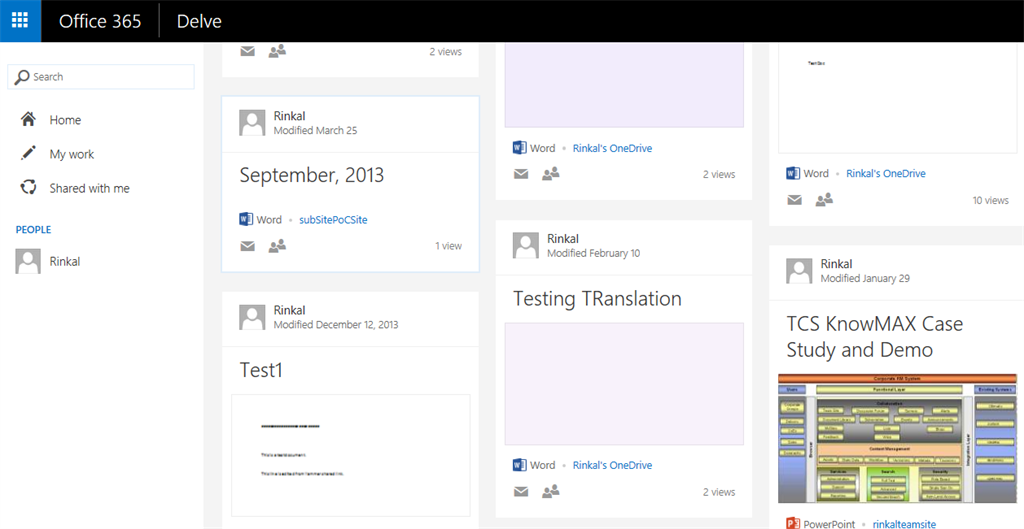 This is a beginner's article to explain the new Delve app on SharePoint Online provided by Microsoft. When you click on the Apps button in your SharePoint site you will see the logo for Delve. Delve is an app that lives in MySite.Click on Delve, you will be taken to this new application. There are no menu items, just three links on the left hand side, Home, My Work and Shared with me and a Search Box on top.So what does Delve provide us? Instead of finding the content we are working on, Delve does. We would normally sort by date descending and find what has recently changed or probably create an alert on the Document Library for any content added or modified. Delve finds the documents and content that have most recently been worked on or the content that we have been given rights to view. Delve never changes permissions. We and our colleagues only see documents that we already have access to.Documents can be added to OneDrive and Shared or can be shared from the Document Library and permission on edit and view can be set when sharing as shown below. In Delve you will see a Tile like rendering with a preview of the file.As soon as you start typing in the Search box, the right hand page is refreshed.There is no number of results or paging specified nor an option to sort. The URL shows it is in the _layouts/15 directory; that means this is an application page.Application pages are not stored in the database. So they can't be accessed by SharePoint Designer. This app is at a very nascent stage; it needs a lot to be done to make it professional level. Probably in the next few updates much more is to come, much more is definitely.