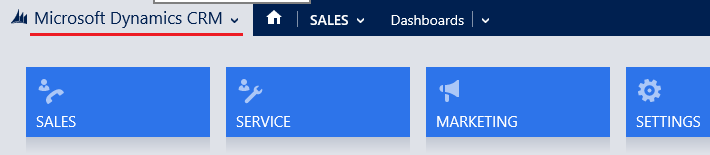 These functional areas are very easily seen when you hover over the Microsoft Dynamics CRM Logo as shown.