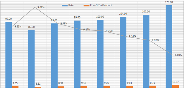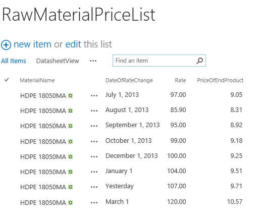 In this article we will see how to link SharePoint 2013 data to Excel and create business intelligence visualisations in Excel. The scenario is that my business user wants to know how the profit margin varies when the rate of raw material increases over a period of time. In this case, the price that the business can levy to it's users is 60% of the raw material price with some profit margin. In this example, we have a calculated the field "PriceOfEndProduct" as =(Rate*0.06+2.15)*1.1+0.28. The data is in a SharePoint List as shown below.