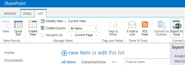 Now to link this SharePoint List to Excel, you need to click on as in the following:List and "Export to Excel", as shown below.