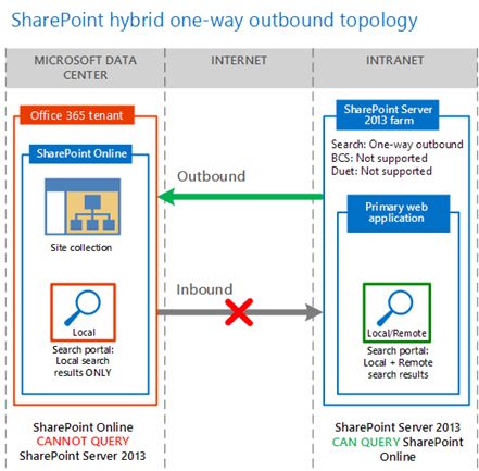An outbound authentication topology lets the on-premises SharePoint Server 2013 farm make authenticated connections to SharePoint Online as shown below.