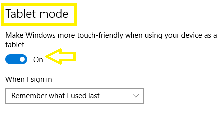 This will open up the settings for Tablet mode in this tab. Now, you can see a slider to turn on or off the tablet mode.