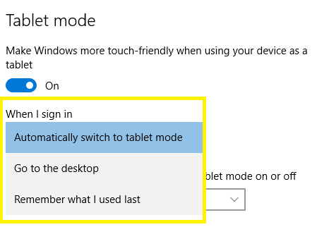 In Tablet Mode second option is when this device automatically switches tablet mode on or off, there are also three options
