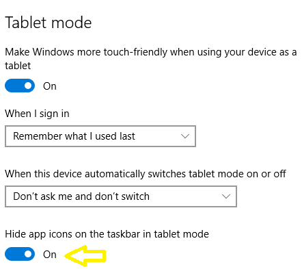 Figure 7: Display or hide the app icons on the taskbar in tablet mode