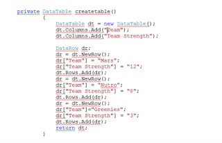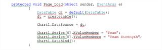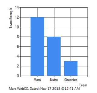 The series section creates the Blue colour columns. We can have more than one series. If we have more than one series, the chart will look like the following one.Let us proceed with a simple example with one series.Let us create a datatable that has team and team strength.I have used the following ADO.Net code. If we wrap this up in a method, it goes like:In the page load:This generates a chart like this:To add labels to the x and y axis use the following code.The final output will be like the following one. I have used a custom font and graphics for printing the final Mars WebCC line.This is a very simple example with charts and we can also bind our charts from a database. There are things like Legends, Annotations, and so on we can add to these charts. Let me provide you an update about this in my future posts. Thanks.