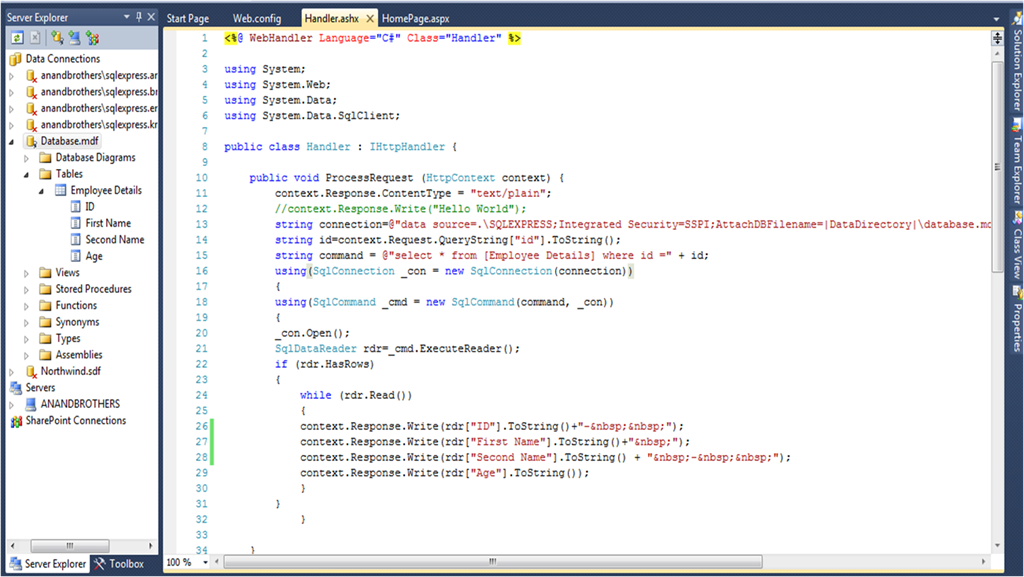 - Right-click on the Solution Explorer and add an .ashx file and by default the name will be Handler.ashx. This is where the data will be loaded. Once added, we can see it in the tree of Solution Explorer. Click on it to see two predefined methods, Process Request and IsReusable. We will use Process Request and the code will be the same, like the select code we use in ADO.Net. I hope you will understand this very well. Here the output is printed using response.write() on the screen.